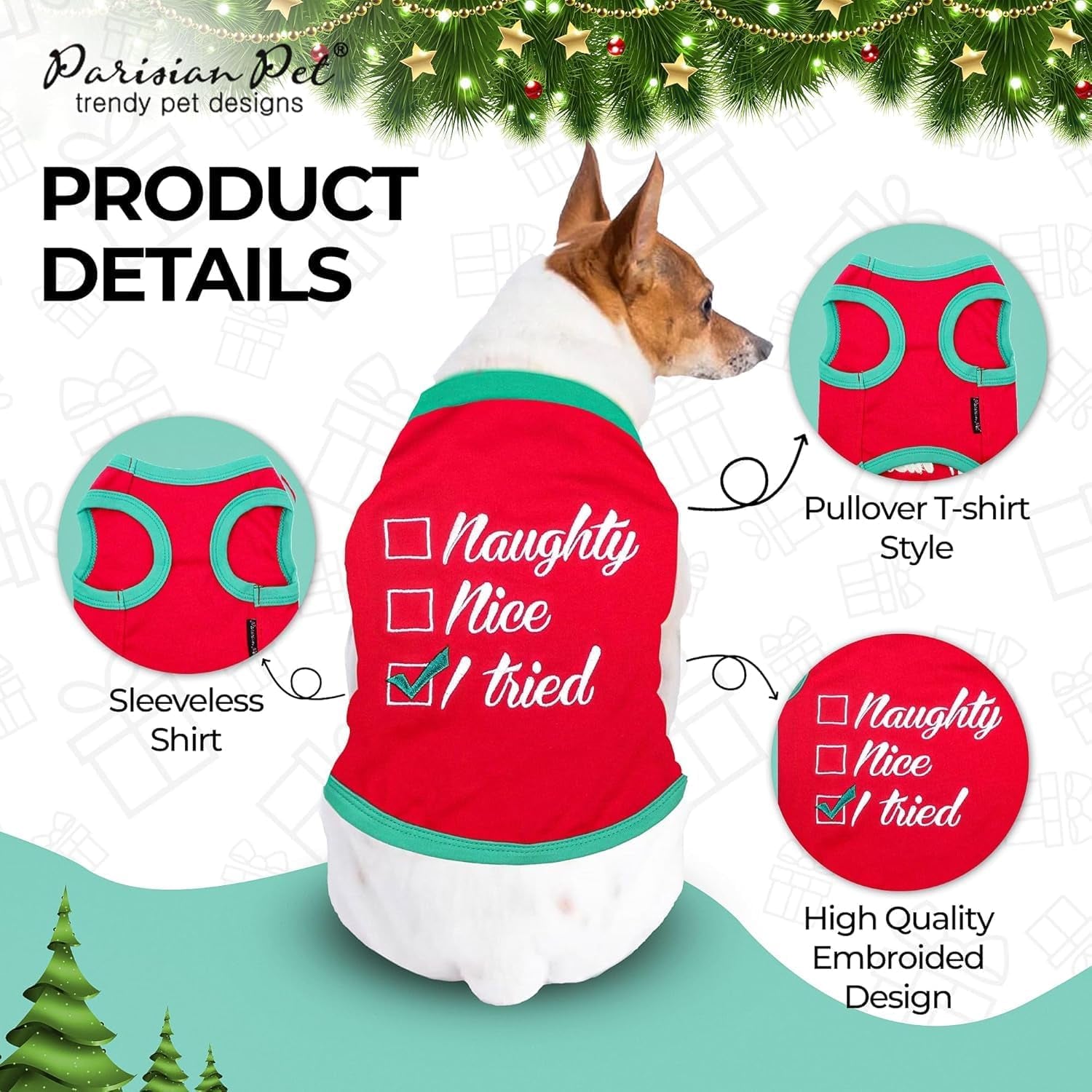 Embroidered 'Naughty or Nice' Dog Shirt - Lightweight Cotton, Sleeveless, Funny Christmas Dog Clothes - XXL