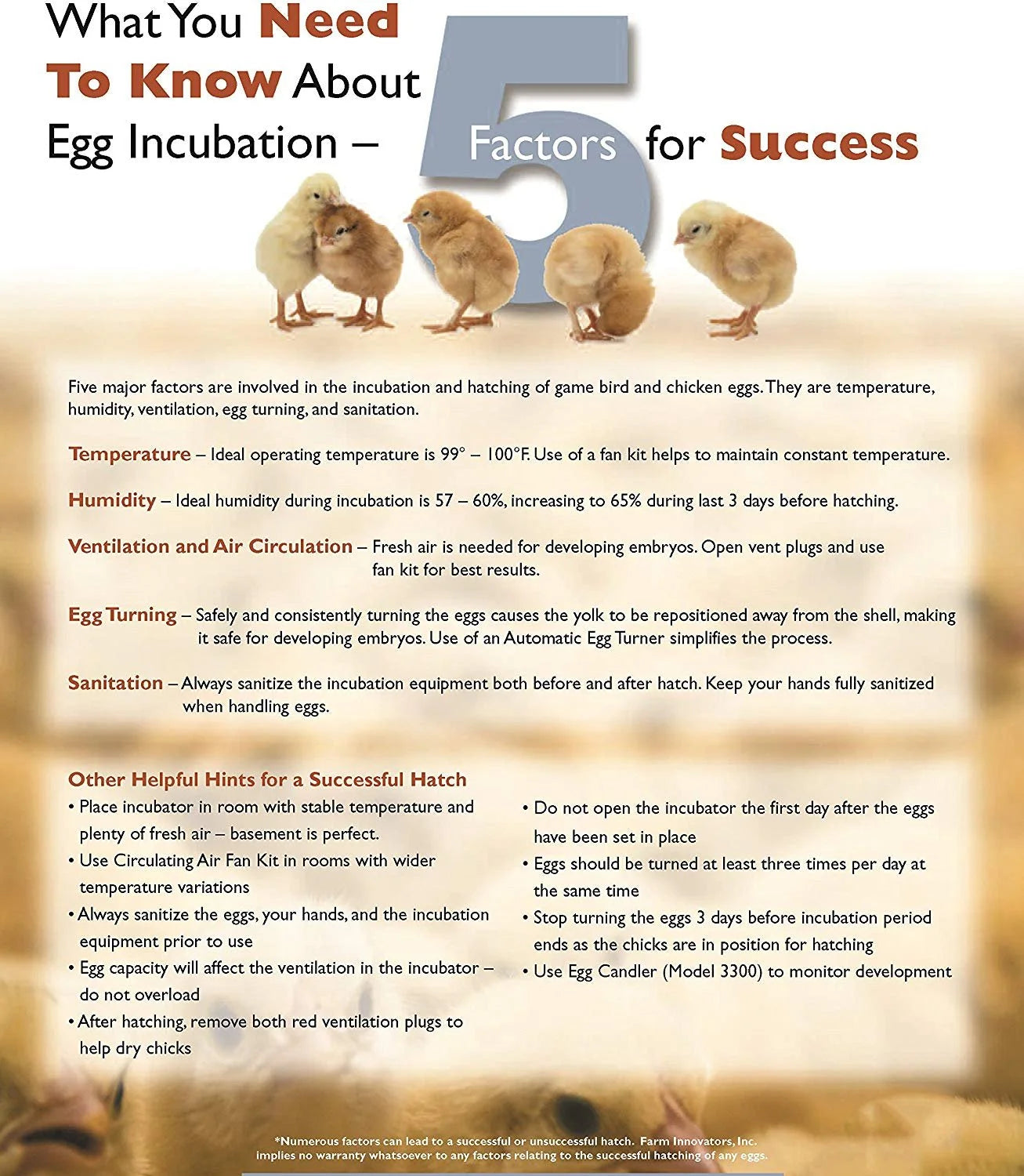 The Farm Innovators Still Air Incubator easily accomodates up to 4 dozen eggs. A built-in hygrometer measures both internal temperature and relative humidity. Solid state circuitry provides long lasting and reliable temperature setting. A red indicator light shows when the heater is operating. Two large 9-1/2-inch by 3-1/2-inch viewing windows allow for observation of eggs. An additional thermometer is included. This is a great incubator for hobbyists and for educational purposes. Made with insulating polystyrene foam. 120 volts; 40 watts; 0.33 amps.